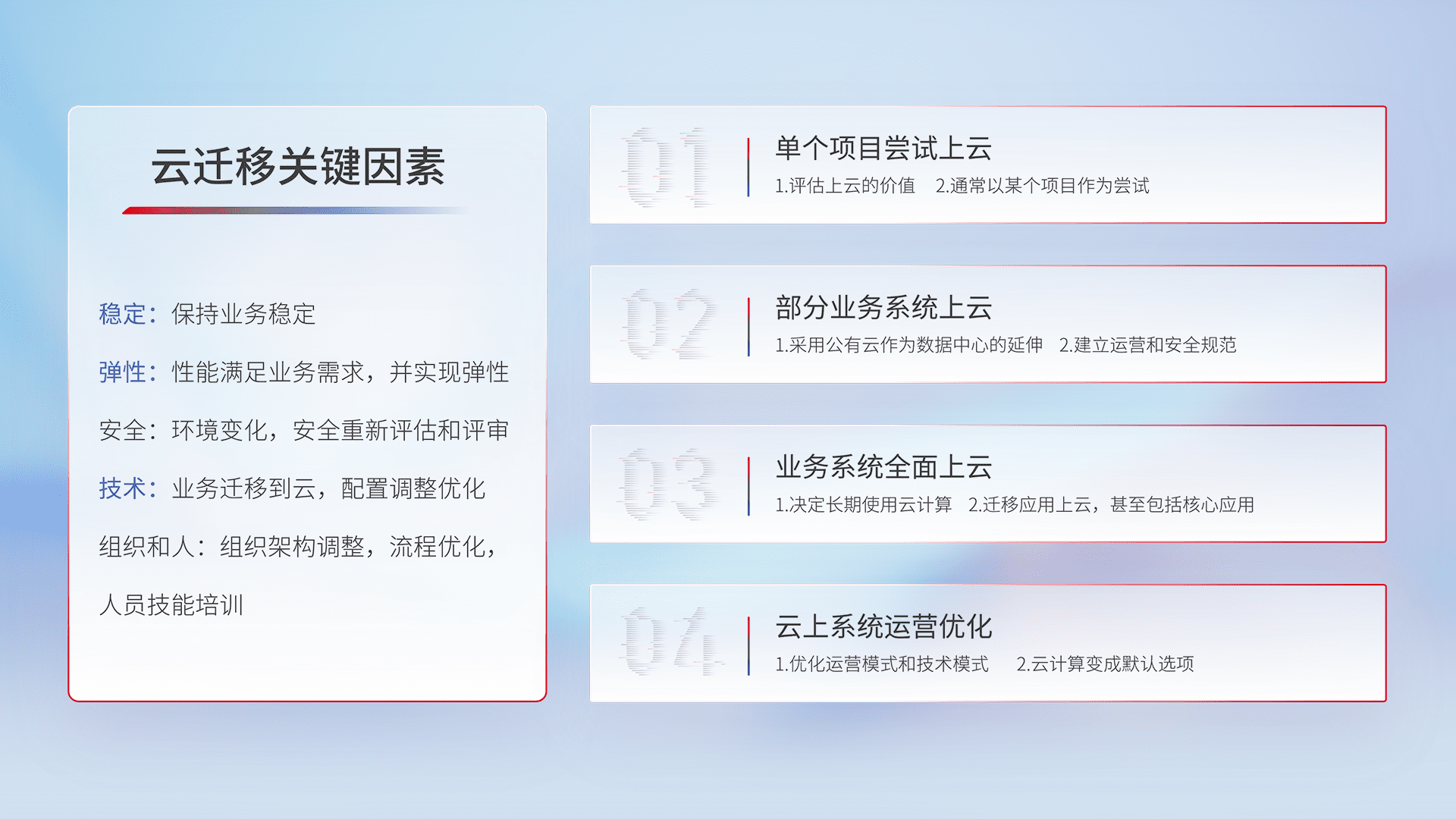 结合实际业务,,从规划设计、、云平台选型、、、、云原生改造、、、、数据迁移、、、、集成交付,,,,迁移全过程为客户识别最佳上云路径,,,做好风险识别管理,,设计网络架构、、、、身份权限、、、、安全审计合规、、、操作审计、、日志审计、、、监控告警策略、、多站点容灾设计等,,对云上基础设施进行整体规划,,提升IT治理水平,,,,以满足弹性、、高可用、、高性能的需求。。。