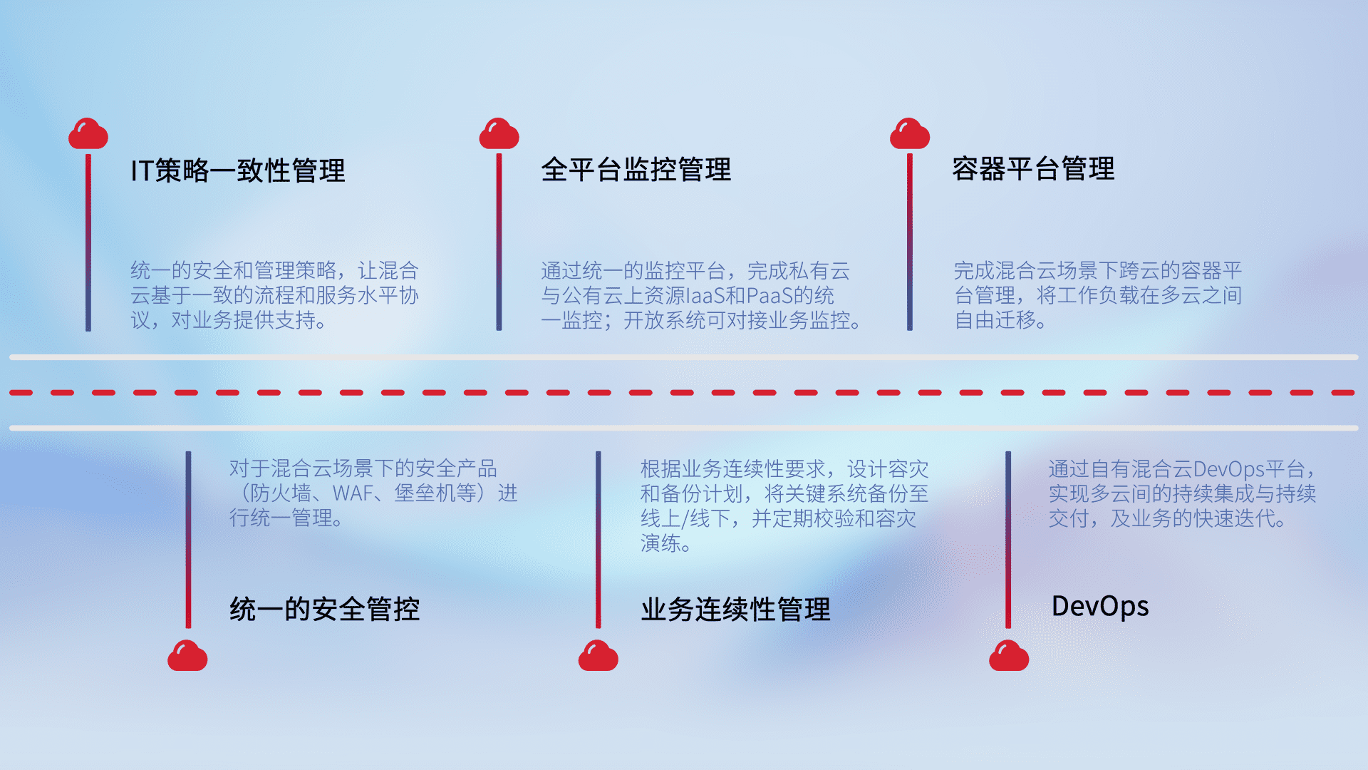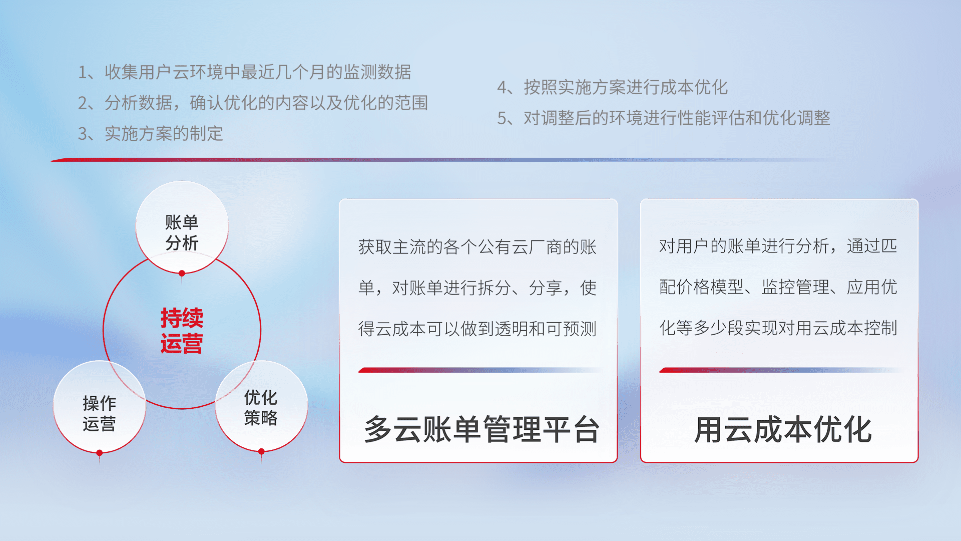 通过多云纳管,,,以统一的资源数据模型把客户的云资源进行抽象和封装,,,进而实现对多云资源的统一操作,,保障云资源管理的可靠性、、、稳定性与可用性。。。。量身定制化运维内容,,,,配置、、、、开发运维、、、、补丁管理、、、备份、、、、监控、、、认证和访问管理、、审计和日常巡检等,,,保障在用云过程中的可靠度,,稳定度以及高可用率。。。。
